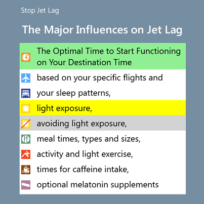 Your StopJetLag Plan Agenda is the key to when you should follow the scientifically based timing for the major influences on jet lag.